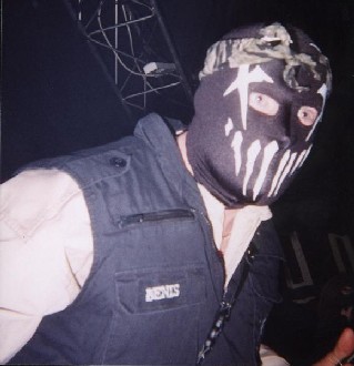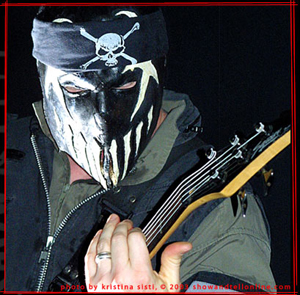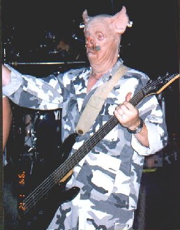 PIG BENIS PLAYS BASS FOR MUSHROOMHEAD (AND HAS A PIGGLY WIGGLY "I'M BIG ON THE PIG" STICKER ON THE BACK OF IT). HIS REAL NAME IS JACK KILCOYNE AND HE ALSO PLAYS FOR 216 AND IS/WAS IN THE BAND RITUAL. HE'S MR. MURDERNICKEL'S BROTHER AND TOOK HIS PLACE IN MUSHROOMHEAD. ONSTAGE, HE'S EASILY RECOGNIZABLE BY THE BANDANA HE WEARS OVER HIS MASK. (BESIDES, OF COURSE, HIS NAME TAG!)